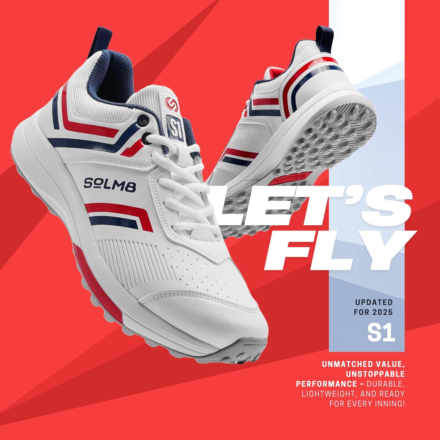 Enjoy your cricket game with the SOLM8 S1 Cricket Shoes – SOLM8 S1 is the ultimate cricket shoe that promises comfort, durability, and performance on the field for all amateur and entry level club players. The foam insole helps keep your feet comfortable throughout the game. The flexible oval cleats offer excellent directional movement, while the midsole with added spring EVA provides a cushioned comfort when landing on field after catching the ball or running across the pitch. The spikeless rubber cleats are suitable for both turf and field play, making these shoes a versatile choice for cricket players of all levels. Order your pair today and take your cricket skills to the next level.